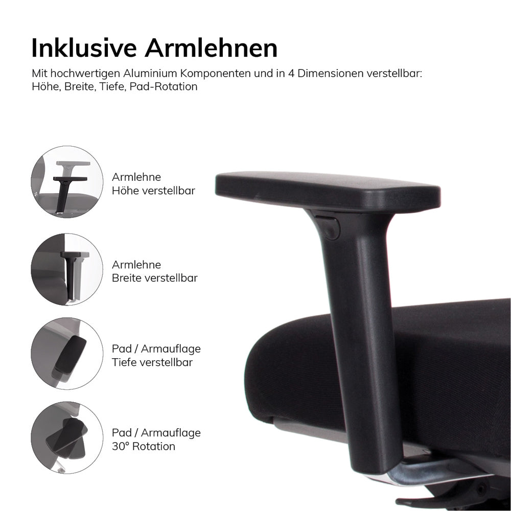 Höhenverstellbarer Rücken / Sensosit Sitztechnologie / Lordosenstütze / AutoActive Syncromatik / Alu Fußkreuz